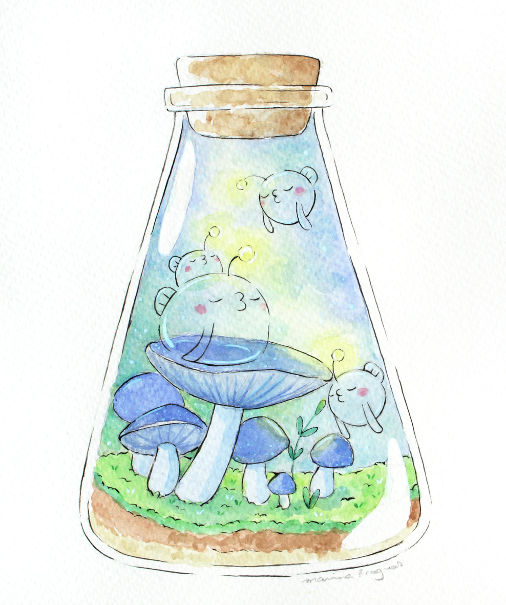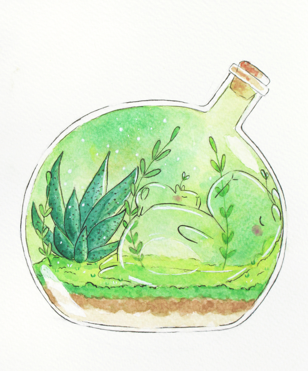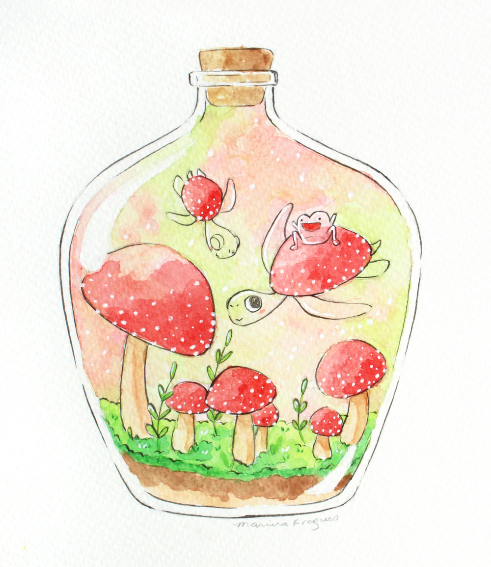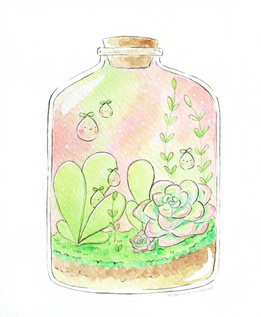 Coleção de 10 pinturas de terrários com diversas plantas mostrando diferentes Interações entre os Invisibilis.
